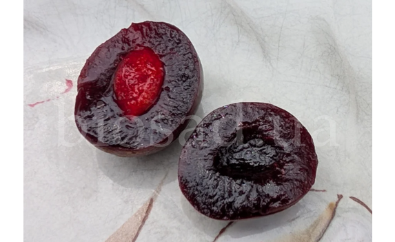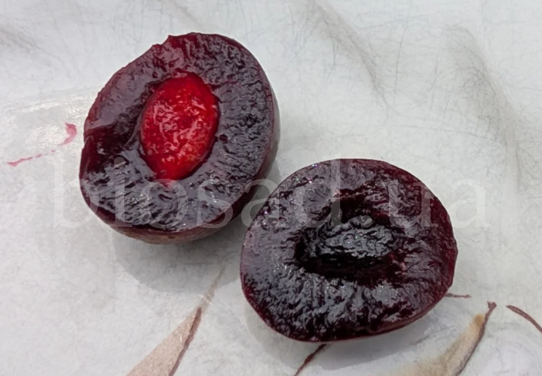 М'якоть соковита, ароматна, темно-червона, кисло-солодка, з оригінальним смаком, що поєднує сливу та вишню.