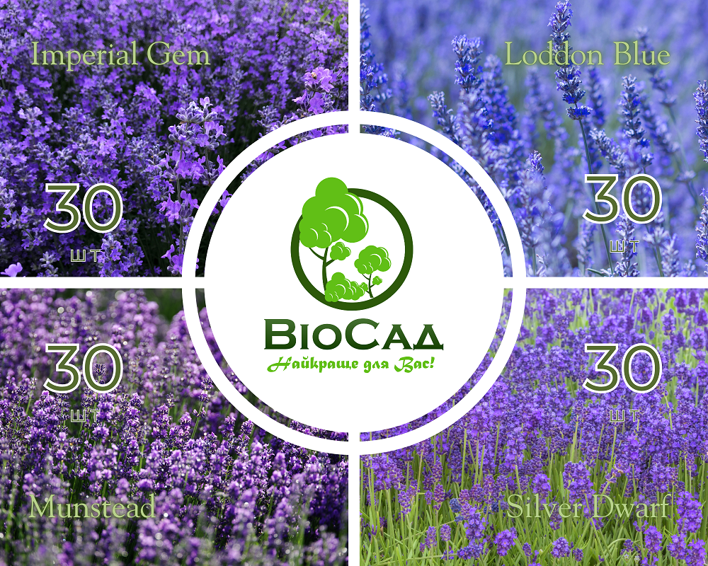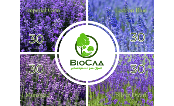 В даний комплект входять чотири популярних сорти англійської лаванди: Лоддон Блу (30 шт.), Манстед (30 шт), Імперіал Джем (30 шт), Сільвер Дварф (30 шт).